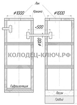 Стандартная канализация включает первую шахту из 3 колец с бетонированным дном и вторую шахту из 4 колец с дном, засыпанным гравием. Точное количество колец рассчитывается на объекте с учетом интенсивности стока.